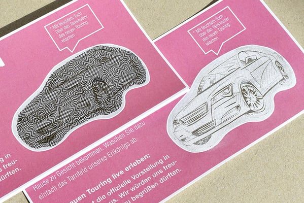 Einladung mal anders: Ein Erlkönig ist eine gängige Bezeichnung für einen Prototypen in der Automobilbranche. Bei unserem Werbemittel wird das Motiv dazu genutzt, ein neues Auto vorzustellen und gleichzeitig die Aufmerksamkeit und Neugier des Kunden zu wecken.